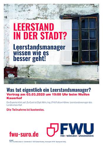 Der Abend war sehr spannend und unterhaltsam und die FWU hofft damit mehr auf das Thema hinzuweisen, damit da mehr geschieht und auch bei uns ein Leerstandsmanager seine Tätigkeit aufnehmen kann.