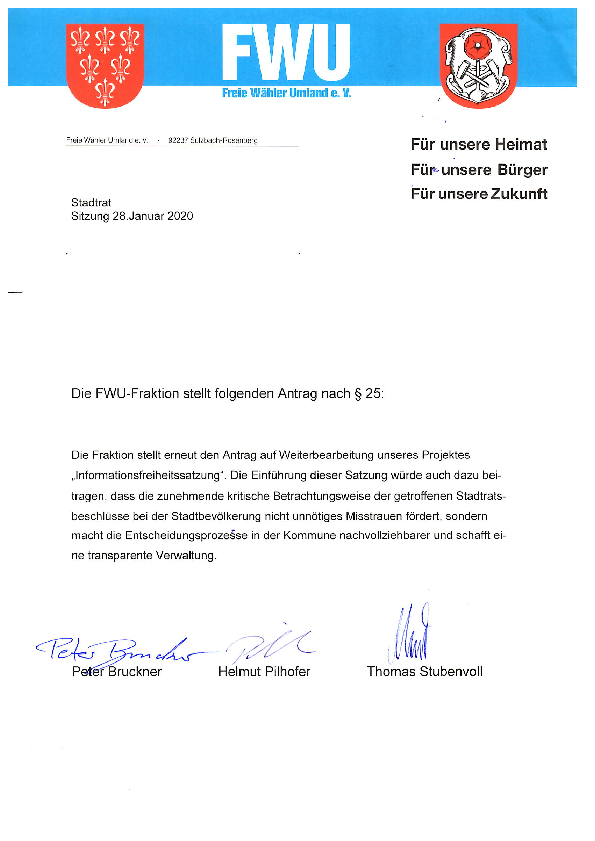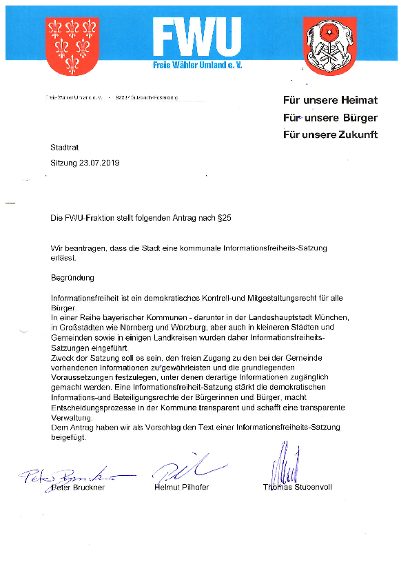 Einreichung auf Umsetzung des Gläsernen Rathauses nach Vorgaben des Informationsfreiheitsgesetzes.