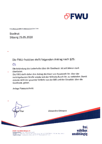 Die FWU stellt daher den Antrag die Knorr von Rosenroth Str. über der zurückgebauten Straße wieder mit der Wilhelm Busch Str. zu verbinden. Damit müsste nicht der gesamte Verkehr von der B85 und der Dieselstr. über die Goethestr. gehen.